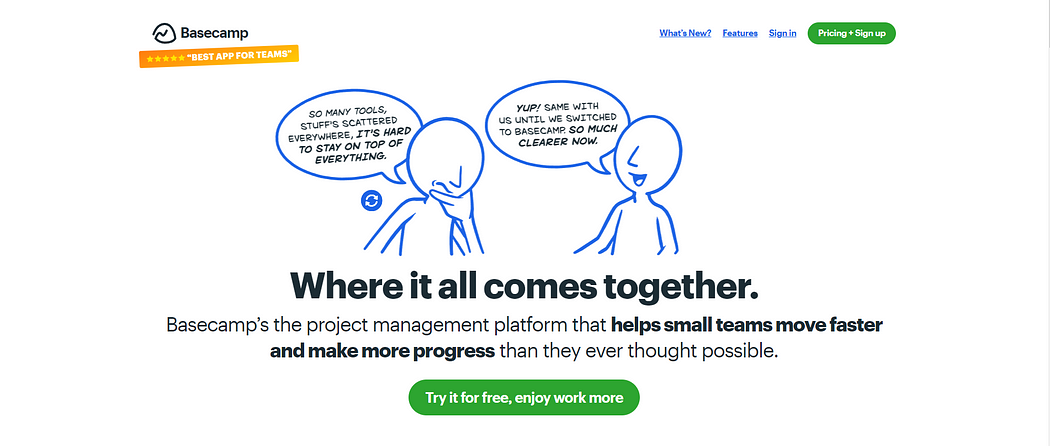 Basecamp’s homepage gets it right with a headline that grabs your attention immediately: “Where it all comes together.”