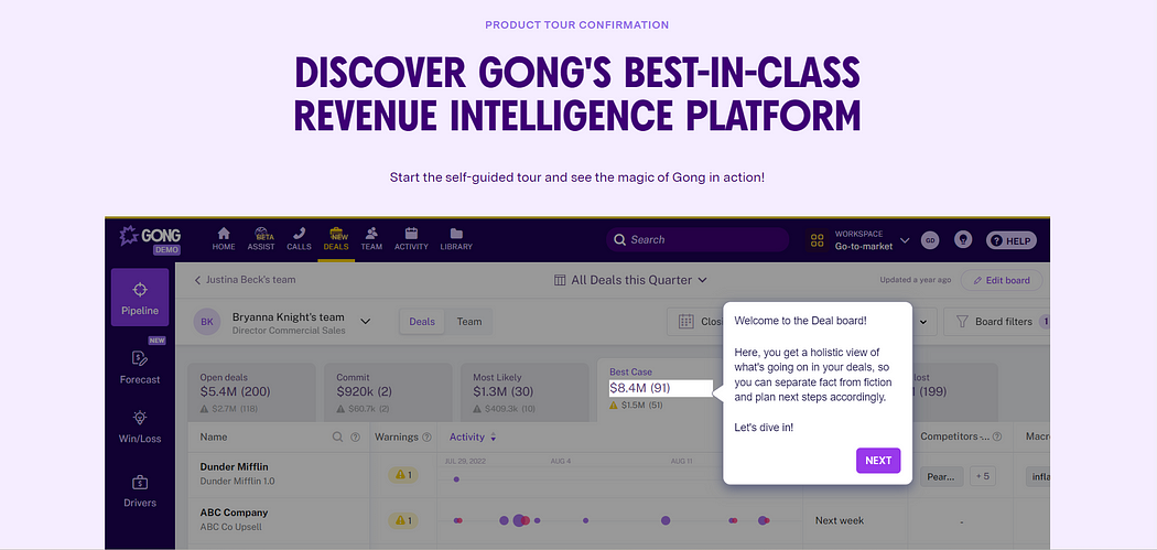 On Gong’s website, you’ll find an engaging interactive guide that takes you through how their platform enhances sales conversations. This approach not only captures your attention but also demonstrates the platform’s ease of use and benefits in real-time. By allowing users to see the product in action visually, any doubts regarding the product quickly turn into confidence.