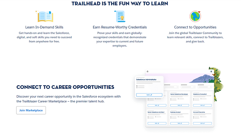 The Salesforce Trailhead platform creates a whole world of learning for their users, with everything from tutorials to community forums.