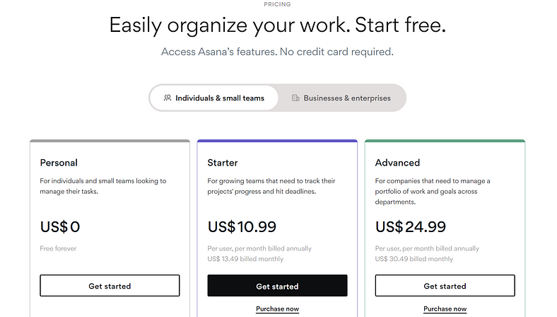 Asana strategically utilizes the decoy effect in its pricing model, presenting three subscription options where one serves as a decoy, ultimately making the preferred plan appear more appealing in comparison.